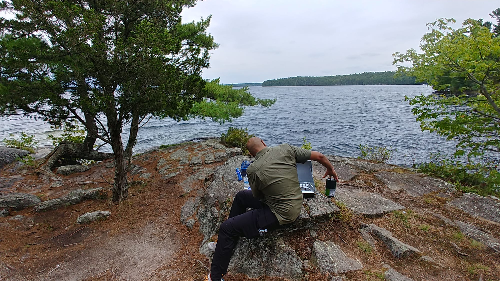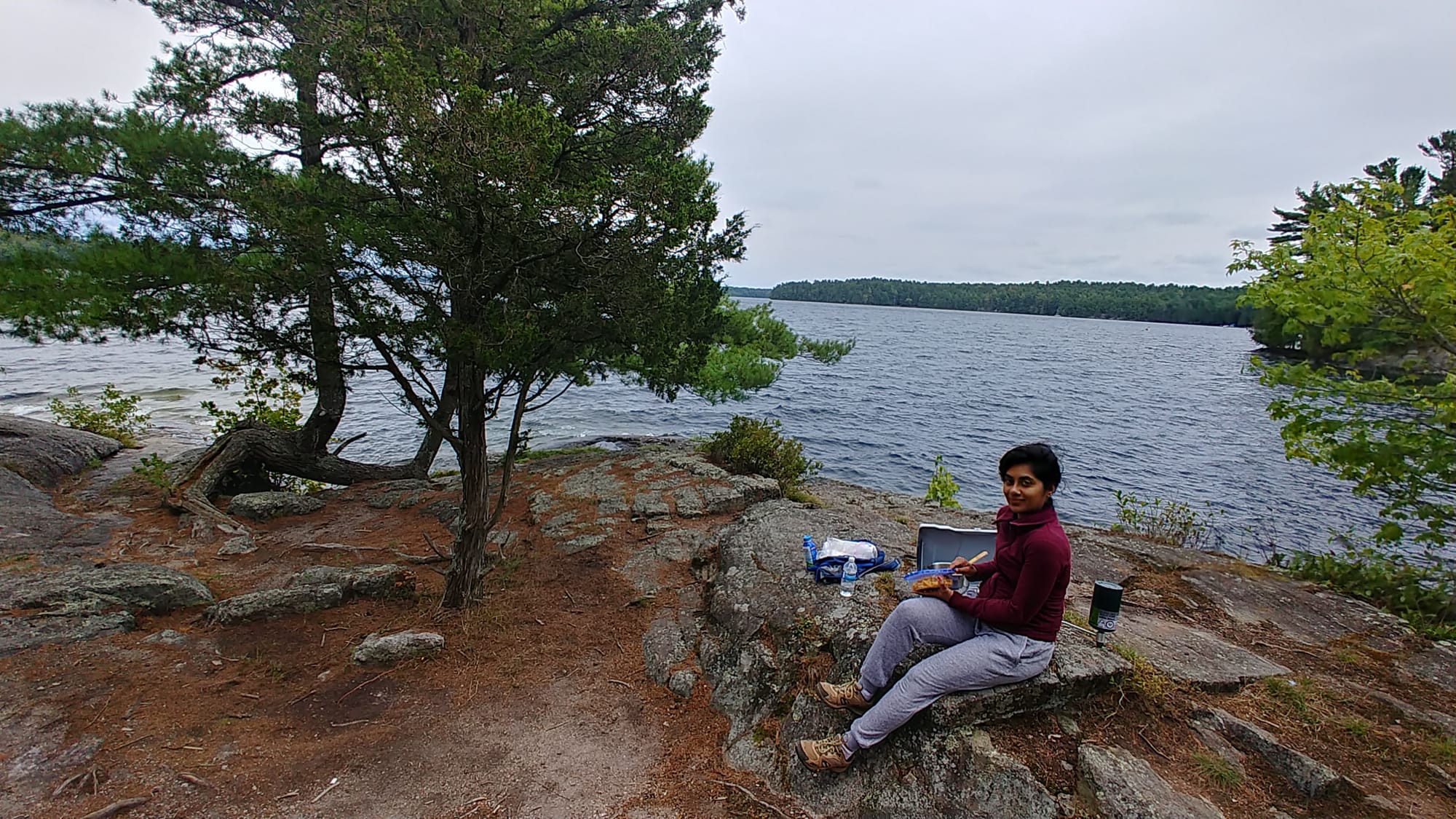 We took our camping stove and some food with us stashed in my backpack. Halfway through the hike, while the picnic table in the area was occupied, we decided to plop down on the exposed rock, and high above the lake on that windy, cloudy day, we ate a meal amidst that rugged, wildly beautiful landscape. And of course, we wrapped up and took all our leftovers and any throwaway items with us.