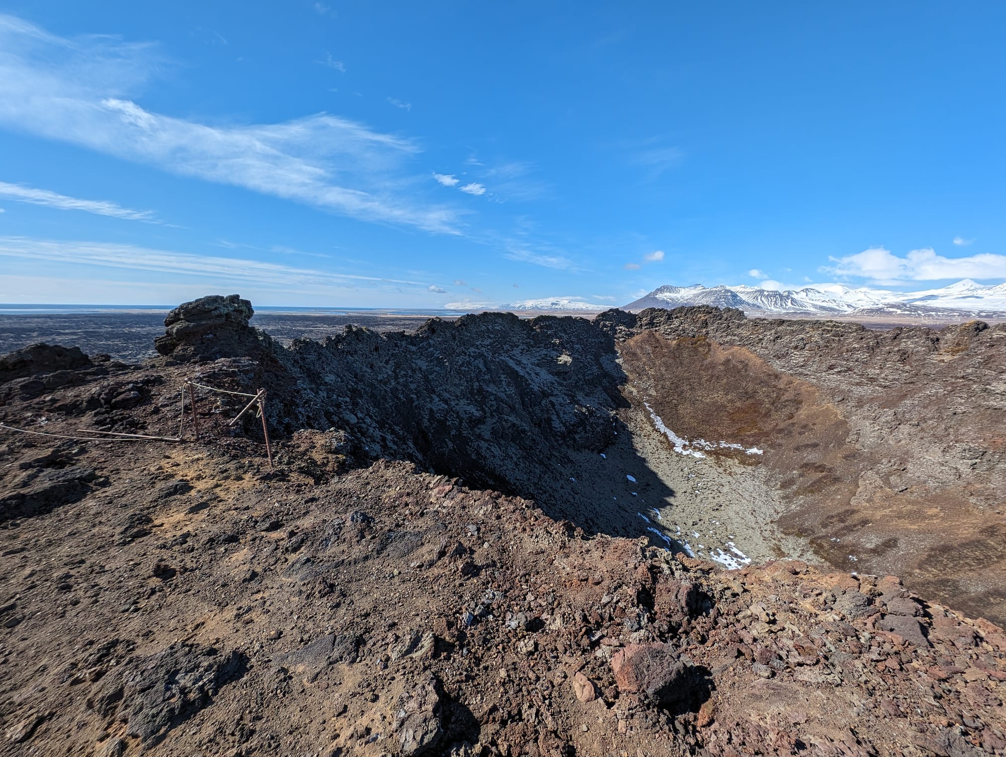 After a lazy morning and a late breakfast, we decided to head out to the Eldborg Crater hike. It was just after noon. The hike was a 7.3km walk to and from the crater, and it was a largely uninteresting walk until the crater. Sparsely populated, we saw maybe two others on their way back near the start; otherwise we were the only ones on the entire hike. There wasn't much of a view to speak of until we climbed up the crater. The path there was quite muddy, and I was wearing snow boots rather than my hiking boots, which kept sinking into the mud so we had to wade our way around carefully. At the crater, there was a chain that helped us climb up. The view at the top was quite nice, and overall, we did not regret the hike, though it did take us 2 hours and 35 mins in total.