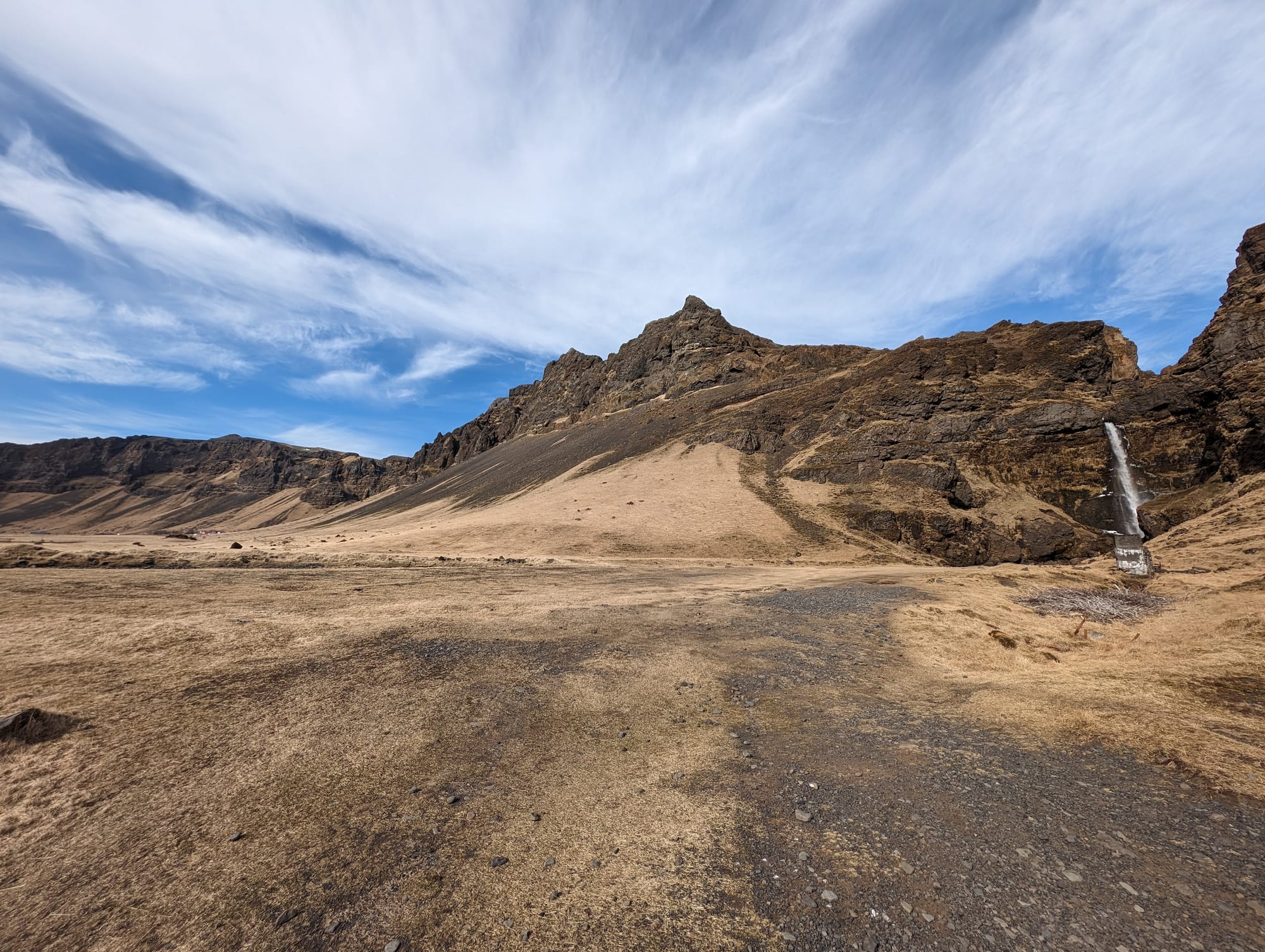 Skogafoss (Skoga Falls): This was a lovely stop with some great views. The Skogafoss can be seen from the parking lot, but if you climb up the stairs to the right of the falls, you will join a longer trail (Fimmvorduhals Trailhead) that takes you past many different waterfalls. The landscape feels unearthly somehow, like we were walking on Mars or something. We did a lovely 30-40 minute walk here after climbing up the stairs. The path was well maintained and wide, but boy was it windy. This area is also a campsite and there was a washroom fee. We spent about an hour here.