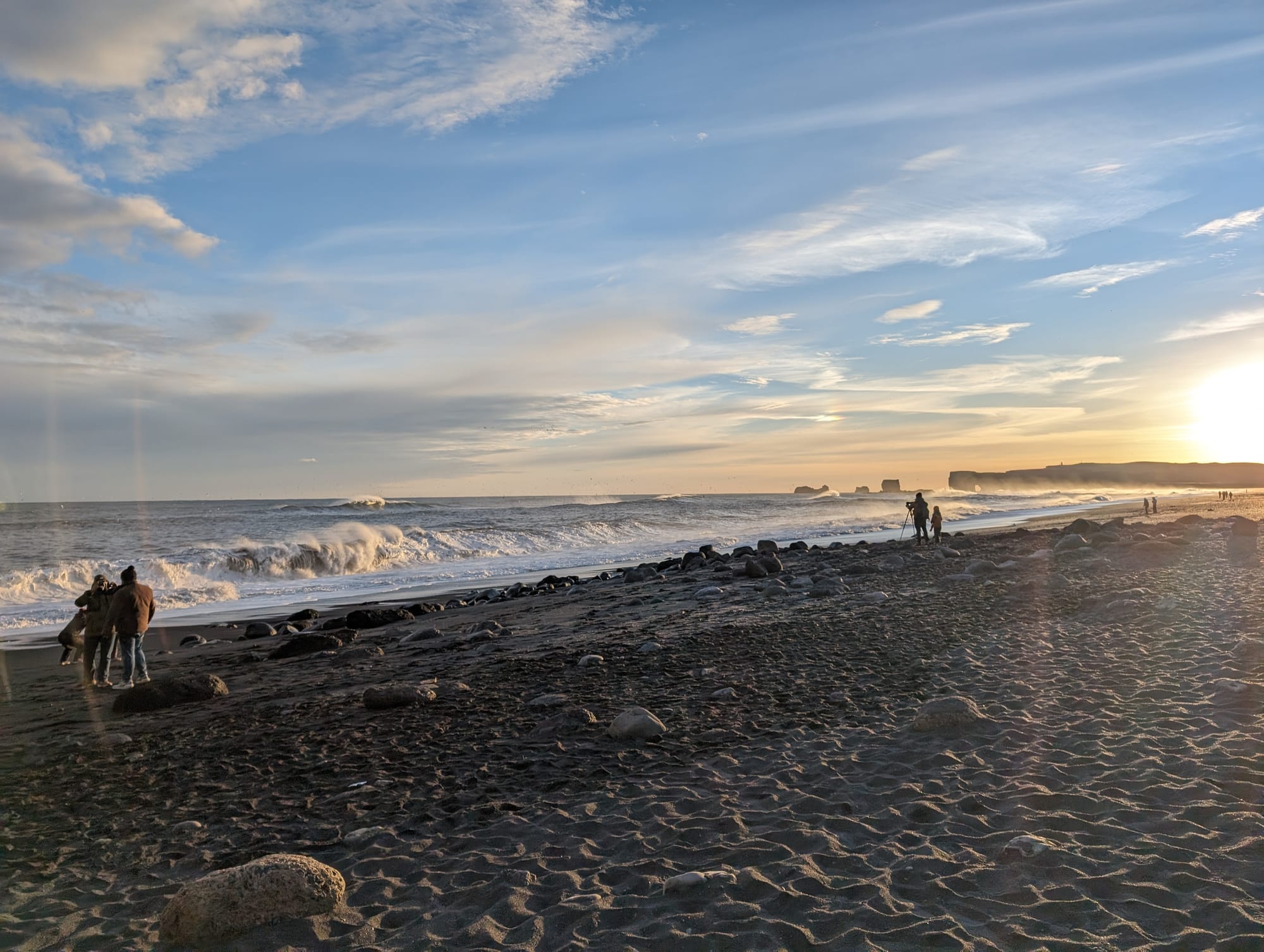 Reynisfjara: Our last stop before dinner! We'd had a long day. Taking in the sunset by the beach was beautiful. Note that there is paid parking at this site. Because of all the stories I'd heard about the dangers of this beach, despite it being quite safe that day, I stayed well away from the waters, though Aman decided to stroll into the cave nearby (I've seen videos of people being stranded in this cave because of the sneaker waves, so I stayed put where I was - I've learned that nature is not something to be toyed with).