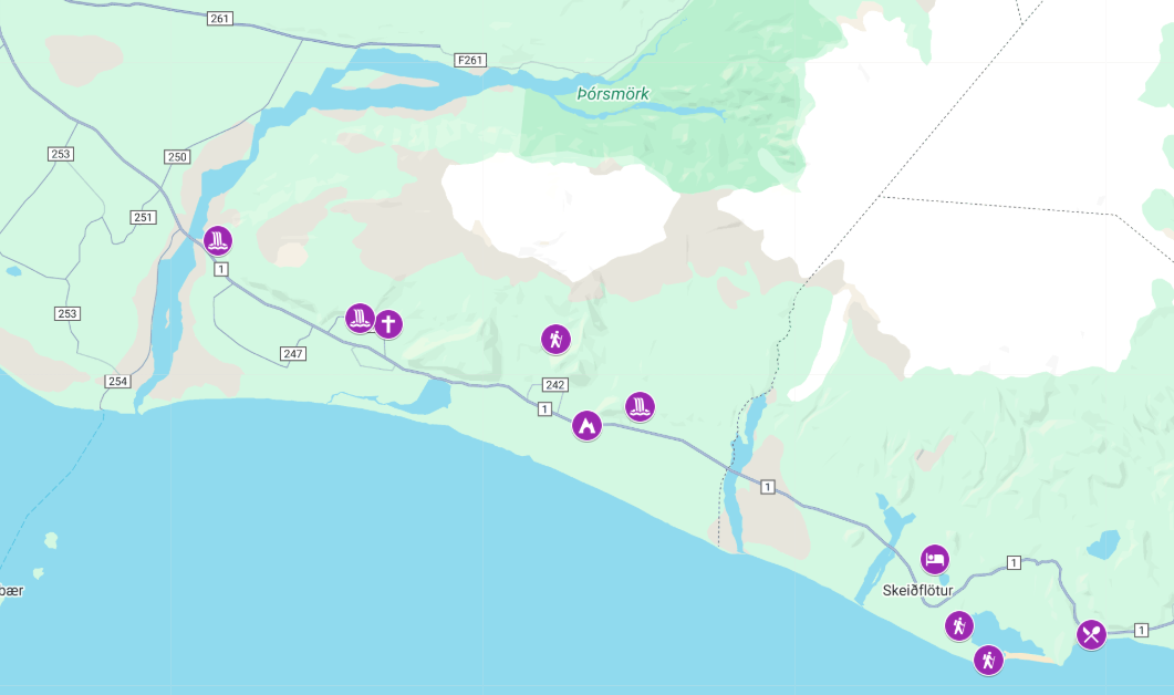 Our Stops: Seljalandfoss, Ásólfsskálakirkja, Irarfoss, Seljavallalaug Swimming Pool hike, Rutshellir Caves, Skogafoss (short hike), Loftsalahellir Cave (short hike), Dyrholaey, Reynisfjara Beach, Black Crust Pizza (dinner), Hotel Burfell to spend the night