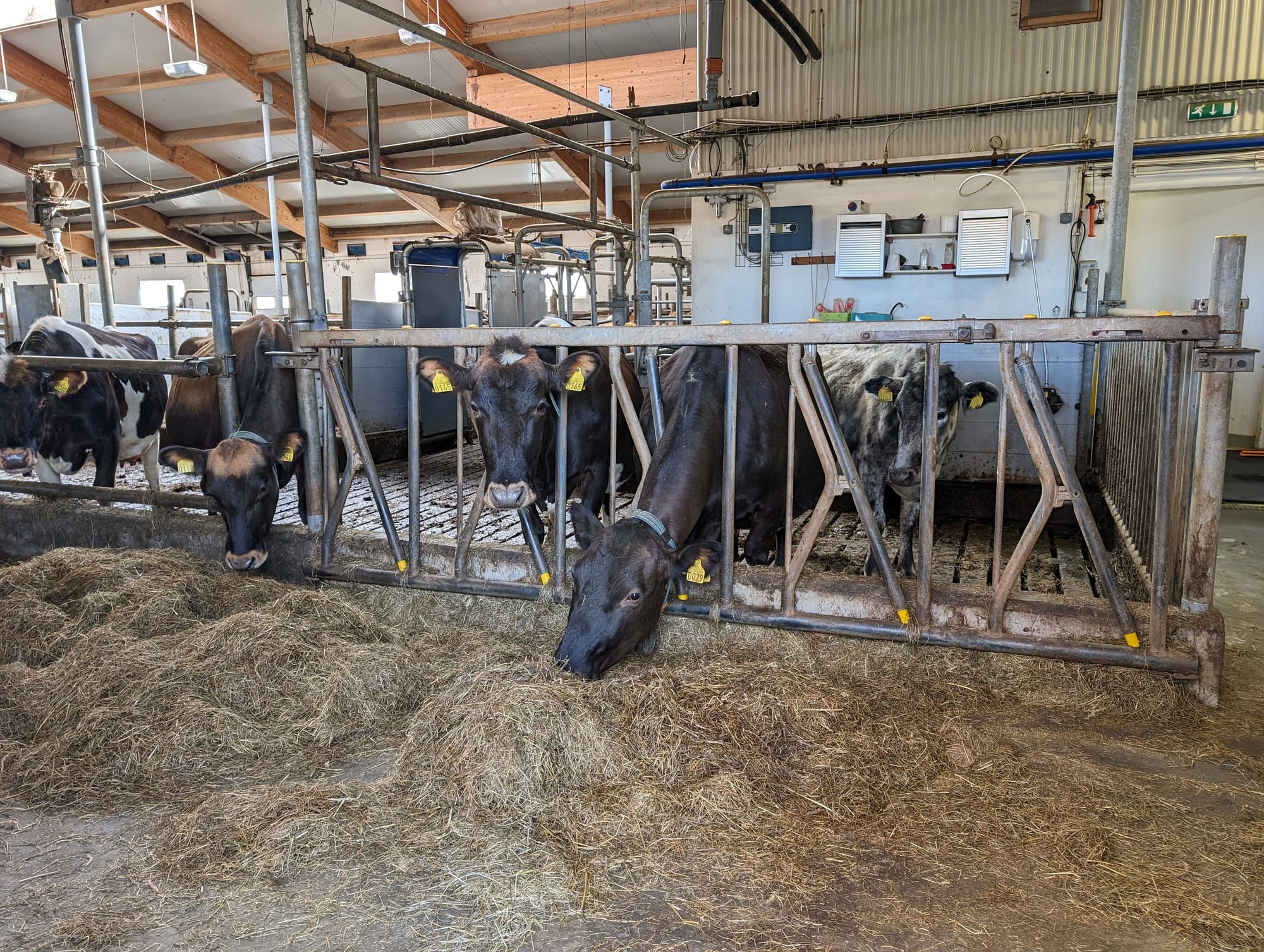 The creamery is located on a big, open farm with barns that held cows. We walked around the building trying to locate someone, and came close to many of the gentle cows, who were probably used to seeing humans and didn't seem startled. A lady drove in, likely noticing our arrival, and asked if the owners were there. We told her that it seemed they were still in Reykjavik. There was also a very gentle dog lying by the parking space when we arrived.