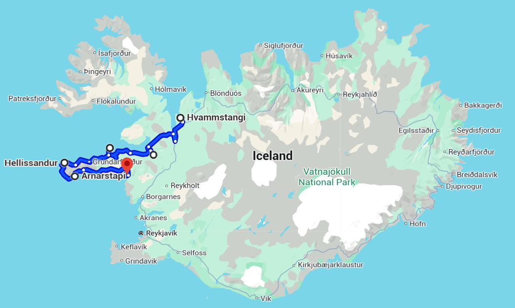 Where we drive from Hvammstangi, attempting to buy some Icelandic farm-fresh icecream (and failing - it was closed 🙁), before driving around the windy Snaefellesnes peninsula and then spending the night at the Snorrastadir campsite.
